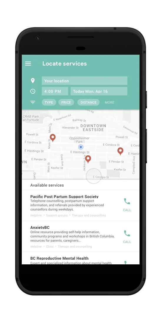 To address new parents’ difficulty in finding postpartum health services, the Service Locator offers various filters to facilitate the process. These filters include options for service type, operating hours and availability, cost (if applicable), distance away, as well as additional amenities, such as childcare or free parking.